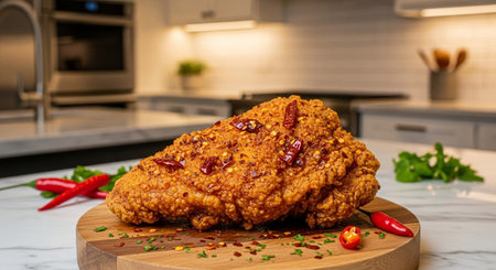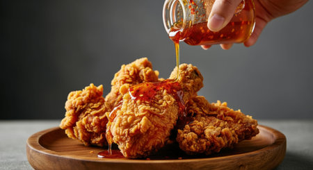 fried chicken with spicy Korean sauce on wood plate