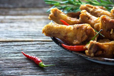 Fried chicken wings. A dish for preparing dinner for beer or wine at home. Selective focus. Background