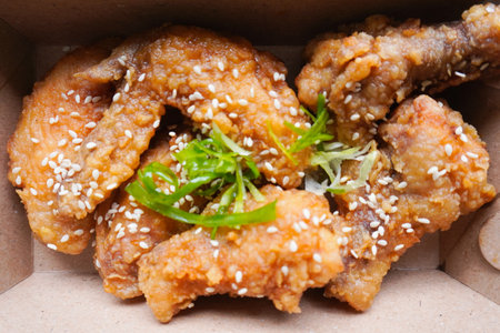 Above view of Crispy chicken drumsticks fired packed in a paper box for delivery or take home.