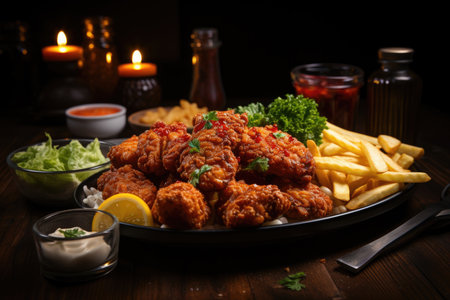 Fried chicken, French fries, Fresh organic vegetables, onion, wave, pepper, garlic