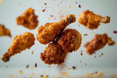 Freeze motion shot of flying tasty fried chicken wings or strips
