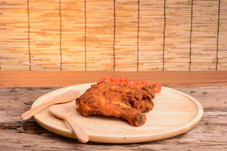 Hot and spicy Korean barbeque fried chicken on wood cutting board over wooden table preparing for meal and tasty