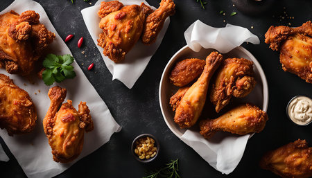 A close-up shot of a plate of fried chicken with a white paper underneath, showcasing crispy chicken legs and wings.