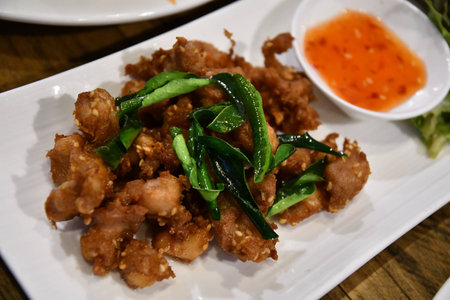 deep fried chicken dish, fried chicken with chili sauce or fried chicken ligament