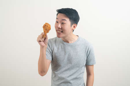 portrait young Asian man with fried chicken on hand