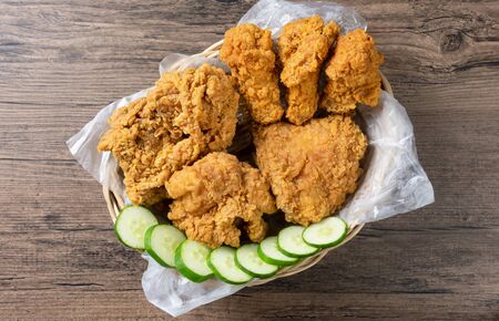Crispy fried chicken in wicker basket serve with cucumber on wooden background. top view. Flat lay.