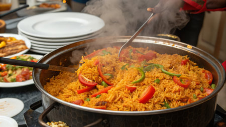 nigerian Jollof Rice served with plantain and stew