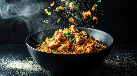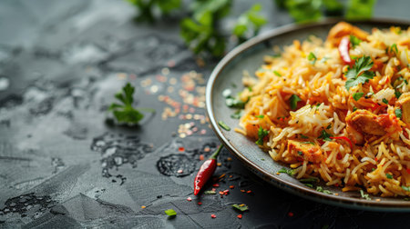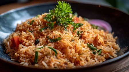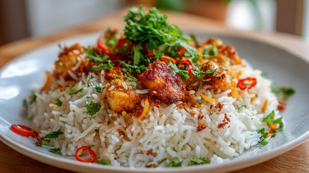Delicious Asian-Inspired Chicken Biryani on a Ceramic Plate, Garnished with Herbs