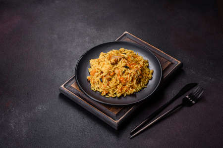 Pilaf with chicken. Traditional oriental hot dish of boiled rice, chicken meat, vegetables and spices in a plate