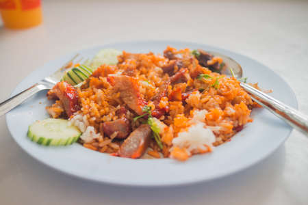 Fried rice with pork, vegetables and eggs. Thai cuisine. Selective focus