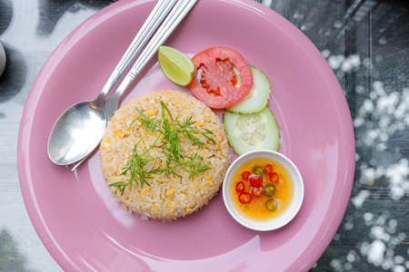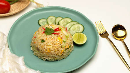 Close up view of homemade Thai fried rice on dinning table with cutlery and napkin