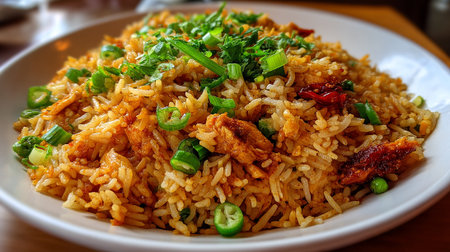 Delectable fried rice with chicken and vibrant green scallions served hot.