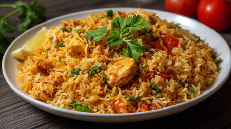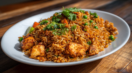 Delicious Chicken Biryani Rice Dish Garnished on a White Plate