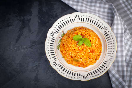 Asian Kabsa dish in a bowl on the gray table. Top view.