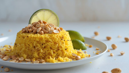 AI Generated. Delicious Turmeric Rice with Peanuts and Lime Garnish