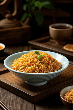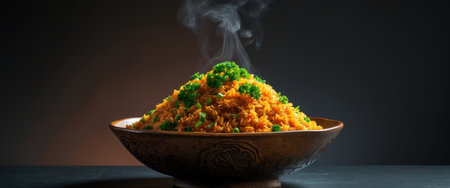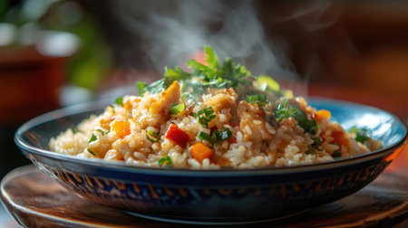 A vibrant bowl of steaming fried rice, garnished with fresh herbs and colorful vegetables. Perfect for a delicious meal at any time of day.
