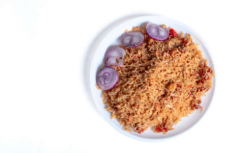 Minimalist african cuisine photography of vibrant jollof rice on white background
