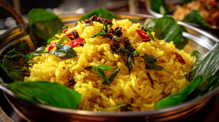 A turmeric rice spicy rice yellow rice fried rice asian food herbs chili pepper basil leaf stainless bowl traditional cuisine aromatic turmeric rice