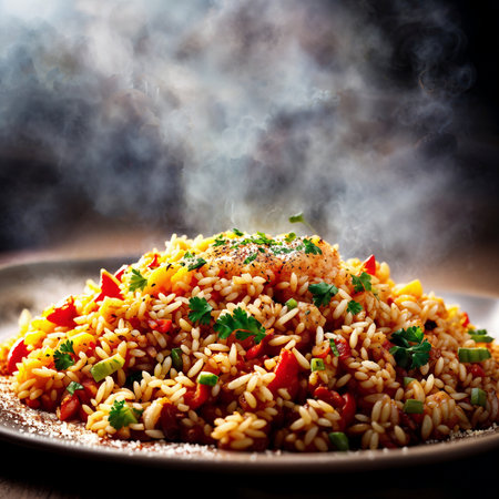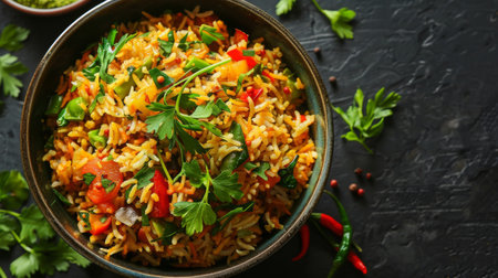 Plov with vibrant herbs and spices on bright background for culinary design