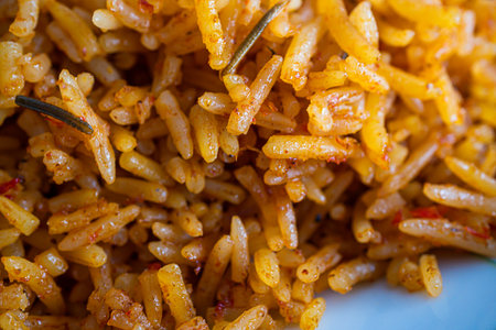 Mexican style spicy Spanish rice with beef carrots green peas bell pepper and hot chili