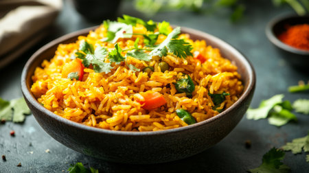 High-angle view of a vibrant bowl of Indian vegetable biryani rice with mixed vegetables and fragrant spices