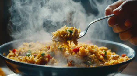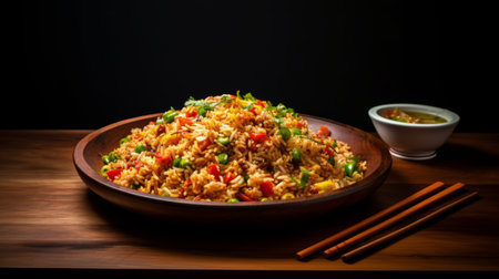 a bowl of rice fried with veggies is beautifully captured in this photo. the vibrant hues of light red and gold create a stunning visual appeal. the realistic and hyper-detailed renderings, captured with the tokina at-x 11-16mm f28 pro dx ii lens, bring out the bold colors and dynamic lines of this chinapunk and indian scene. ai generated