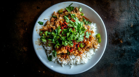 Bowl of hot spicy curry rice with chilli and herbs, selective focus