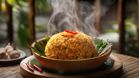 A steaming portion of fried rice served in a traditional bamboo bowl, surrounded by fresh herbs and garnished with sliced red chili.