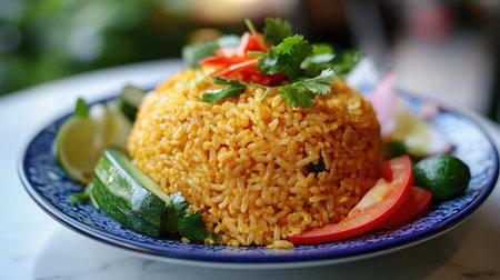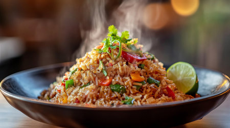 A steaming plate of fried rice garnished with fresh herbs and lime, showcasing vibrant colors and an inviting presentation ideal for culinary delights.