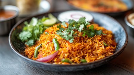 Close-up of a vibrant plate of biryani with colorful spices, garnished with fresh herbs and served with a side of raita and salad.