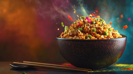Aromatic Fried Rice Tossed in Air with Chopsticks, Colorful Vegetable Garnish in Motion on Purple Background AI Generative