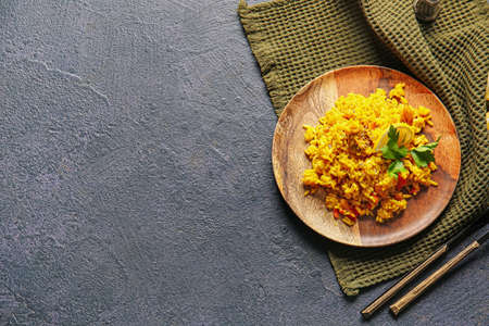 Plate with tasty pilaf on dark background