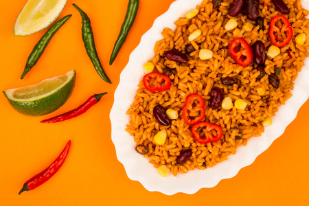 Mexican Style Spicy Rice With Kidney Beans and Red Chillies Against An Orange Background