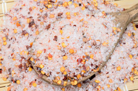 pink salt with chili seed on wooden table
