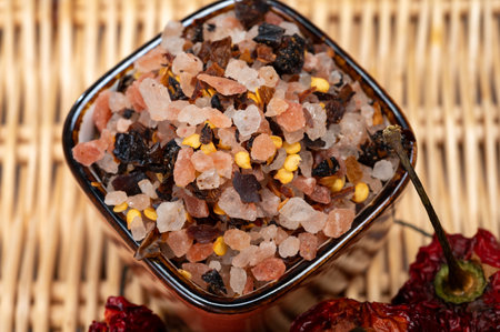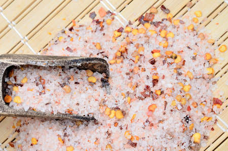 Pink himalayan salt crystals with dried seeds of red hot chili peppers and herbs, cooking with exotic salt, close up