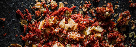 Dried tomato and chili pepper closeup on luxury stone background as flat lay, dry food spices and recipe ingredients