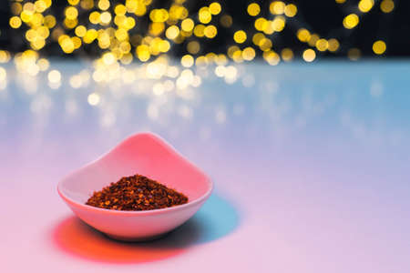 selective focus of a bowl with spices in it such as cayenne pepper flakes with a background of yellow lights with copy space
