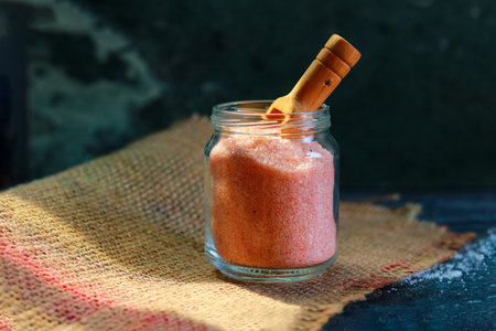 Pink bath salt in a glass jar with a wooden spoon on the table
