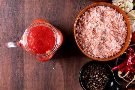Tomato juice with spices, top view on wooden background