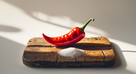 AI Generated. A Single Red Chili Pepper on a Wooden Board with Salt