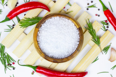 Top view of white sea salt in a round wooden bowl with flat lay red chilli pepper, peppercorns, garlic and rosemary on food background.