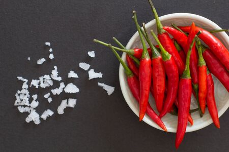 Red hot chili peppers on a green plate with salt crystals nearby on a black background. Asian species.