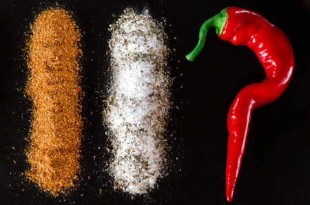 Chili peppers, salt, spices, Svan salt and seasonings lie on the black stone