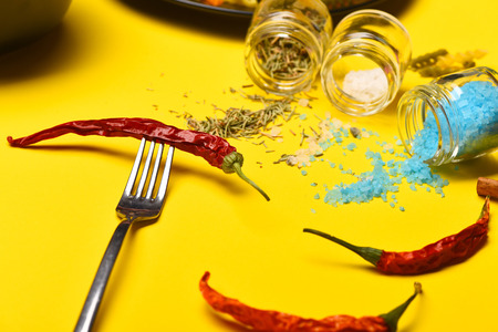 Metal fork with red chilly peppers and salt crystals, blue and white, spices and herbs spilled from glass jars on yellow background. Ingredients for cooking and seasoning food