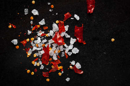 Detailed close-up of Organic red chilli flakes with seed and small crystals of salt, isolated over black background
