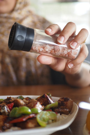 Person seasoning food with salt in a restaurant setting