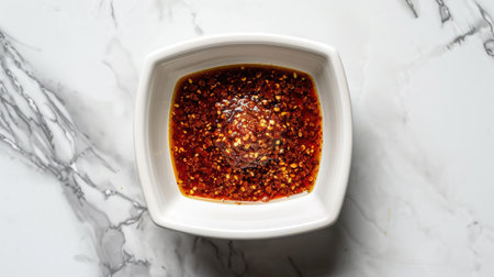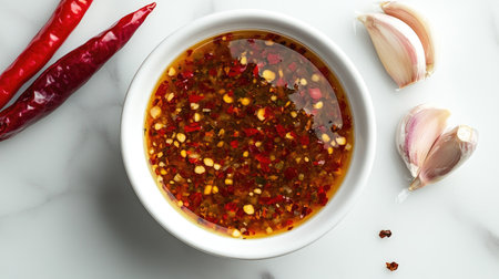 A vibrant bowl of spicy chili oil filled with garlic and fresh red peppers, ideal for enhancing dishes. Perfect for food photography and culinary inspiration.