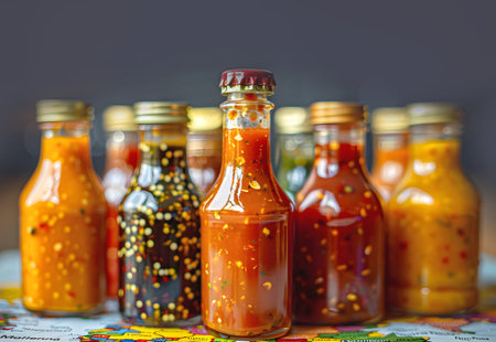 This captivating image showcases a collection of vibrant glass bottles filled with spicy red sauce, perfect for enhancing any meal or culinary creation.