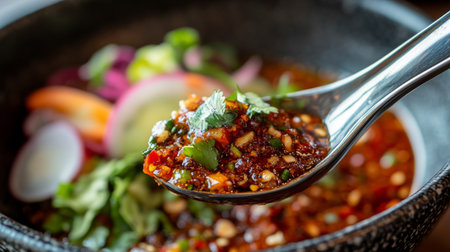 A close-up view of vibrant homemade spicy sauce served on a spoon, filled with fresh herbs, spices, and colorful ingredients, perfect for enhancing dishes.