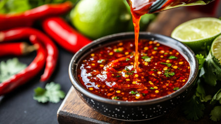 A vibrant chili sauce being poured into a small dish, with fresh chilies, lime, and coriander in the background, creating a spicy and flavorful condiment spread